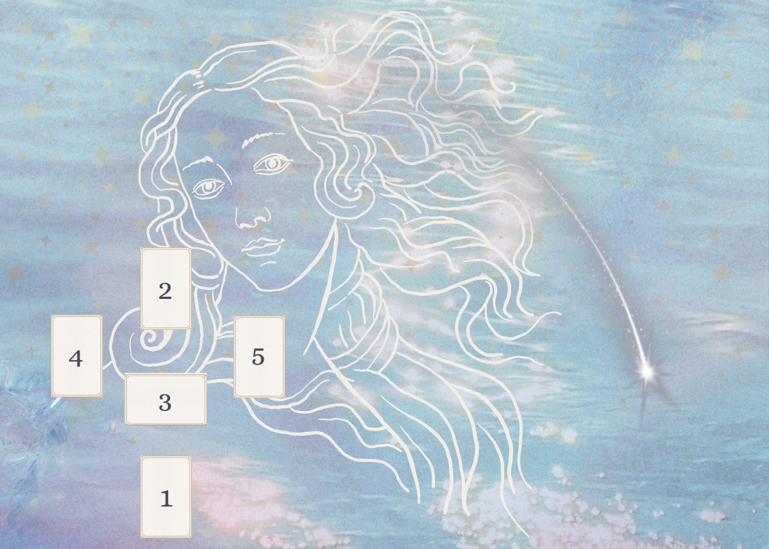 Arrange your five cards in a shape that feels right to you. I recommend the shape above, where the first card represents rising from the seafoam.